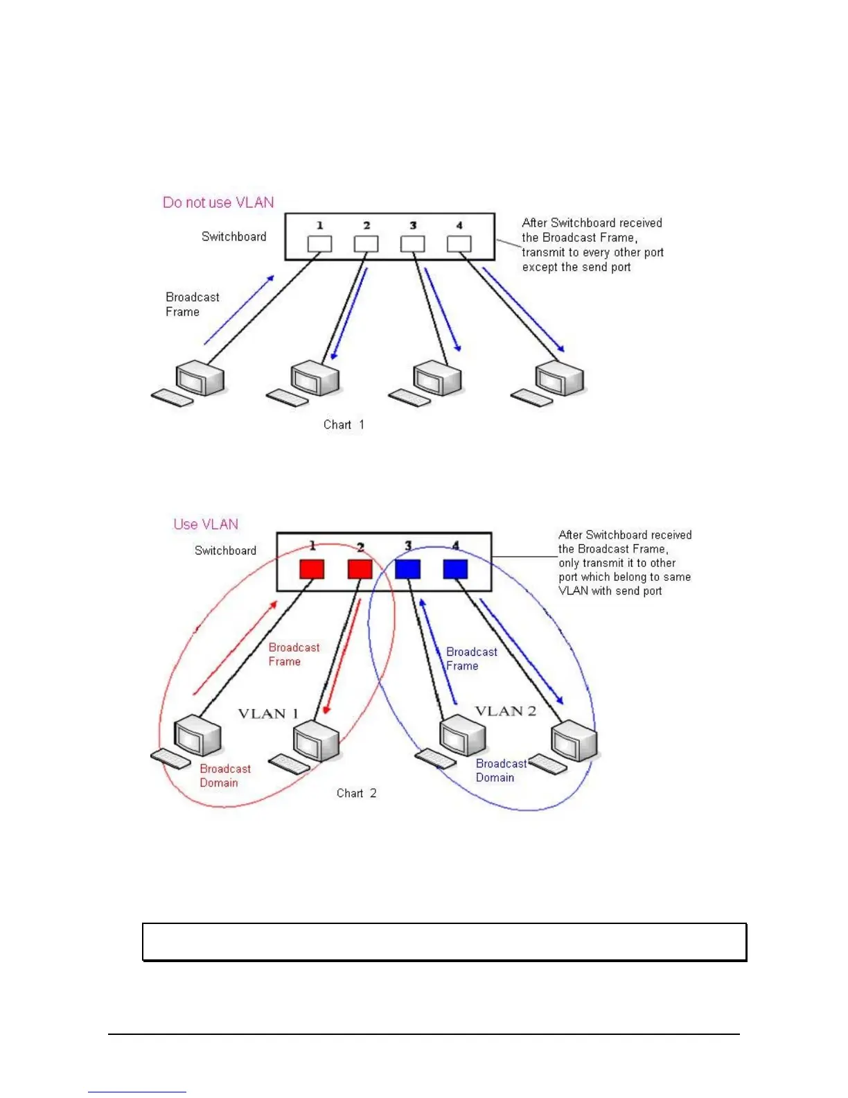 In chart 1, there is a switch without setting VLAN. Any broadcast frame will be transmitted to the