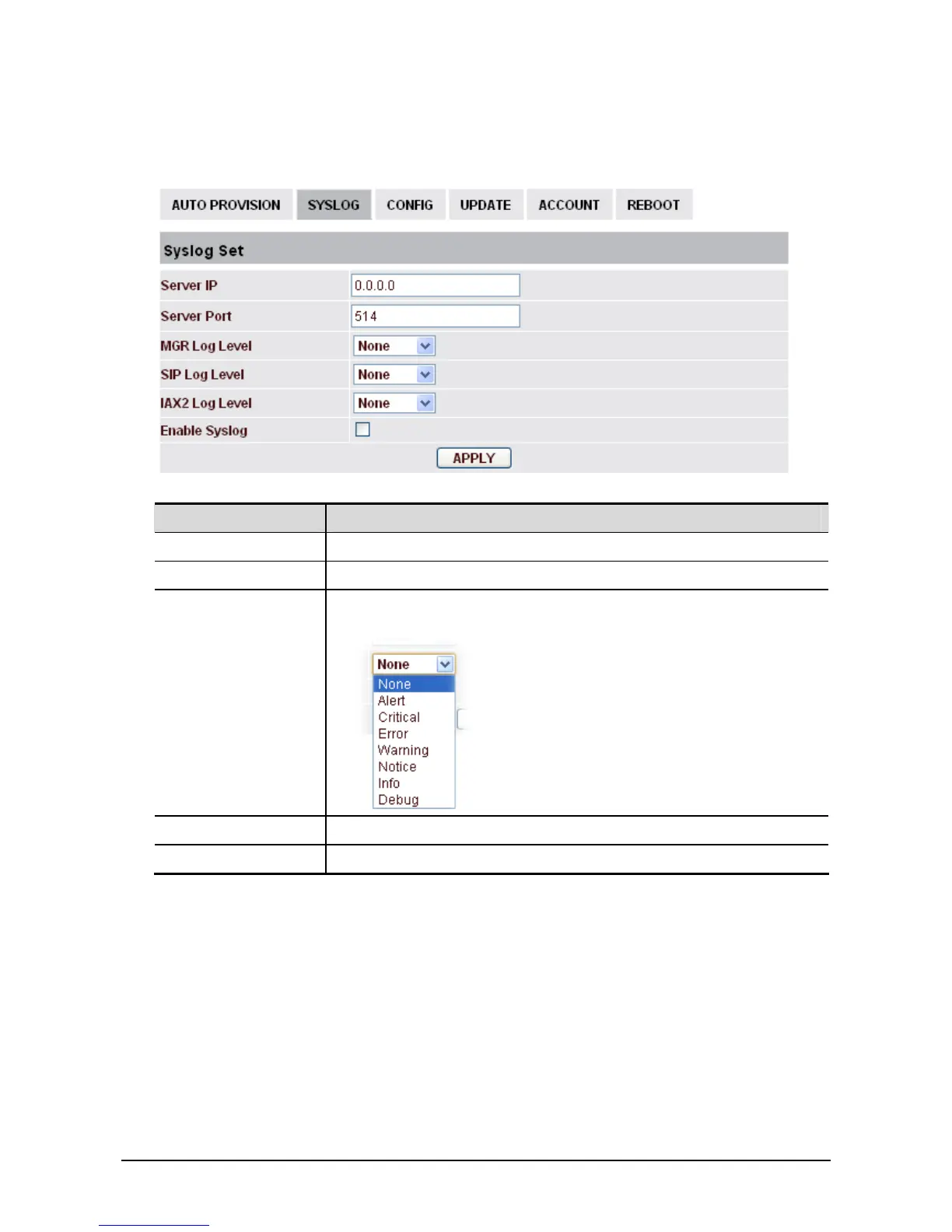Set the level of MGR log/ Set the level of SIP log/ Set the level of IAX2