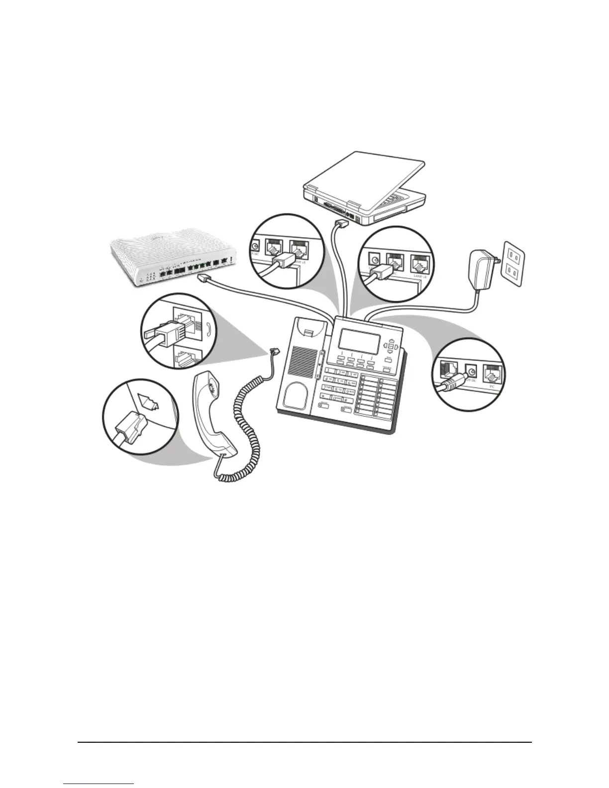 The following illustration shows how to connect the VoIP phone to power, LAN, WAN, and the handset