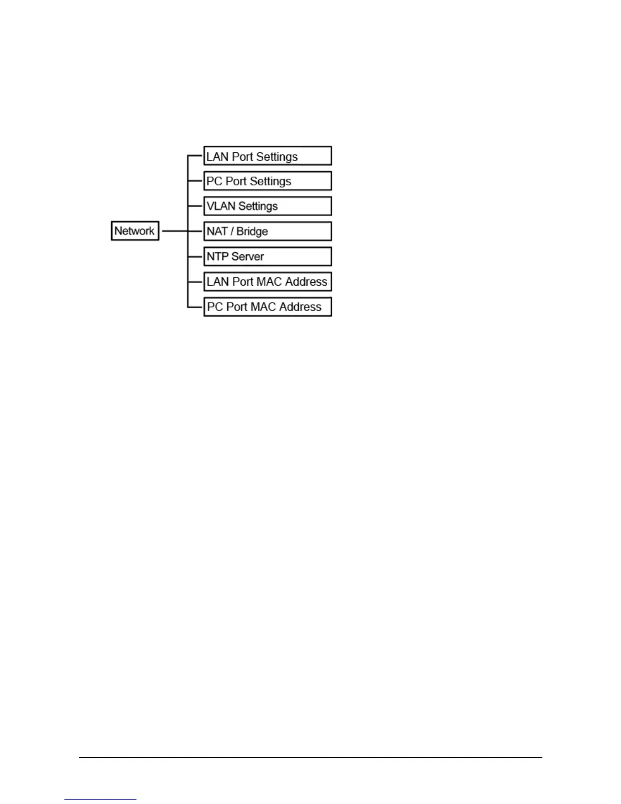 The Network option allows you to setup your LAN Port, PC Port, VLAN, NAT/Bridge, NTP Server and