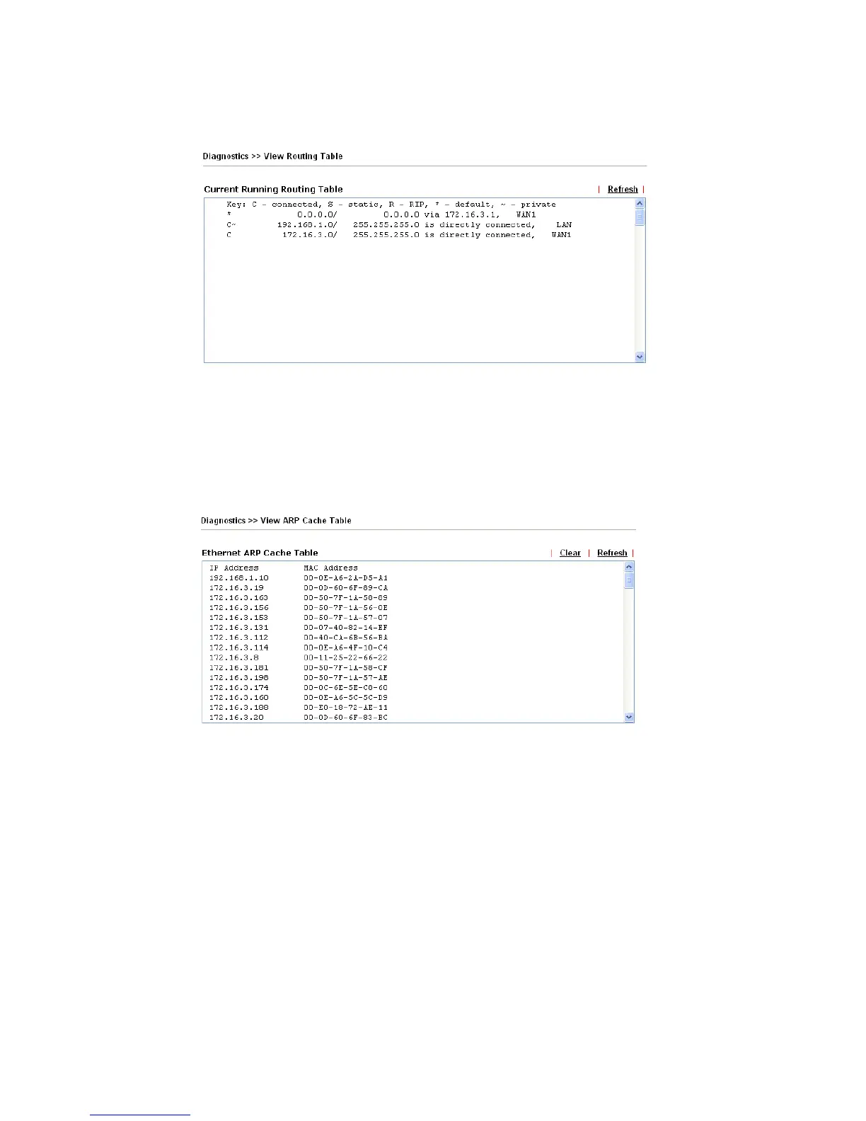 Click Diagnostics and click ARP Cache Table to view the content of the ARP (Address