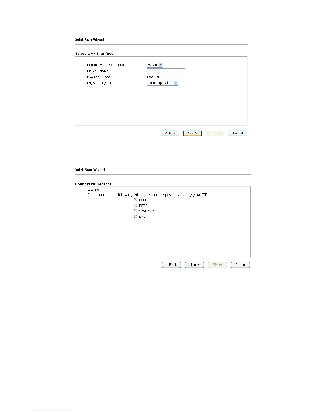 In the Quick Start Wizard, you can configure the router to access the Internet with different