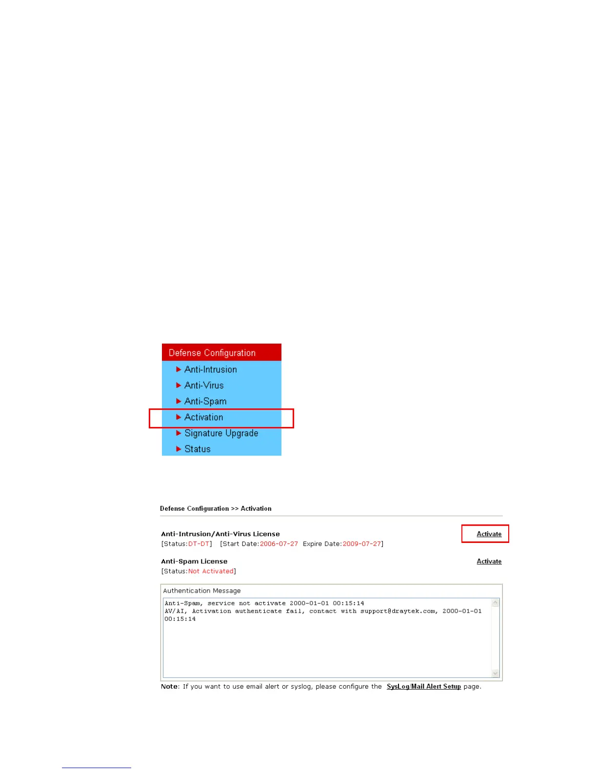 3. Click the Activate link from the Defense Configuration >>Activate web page.