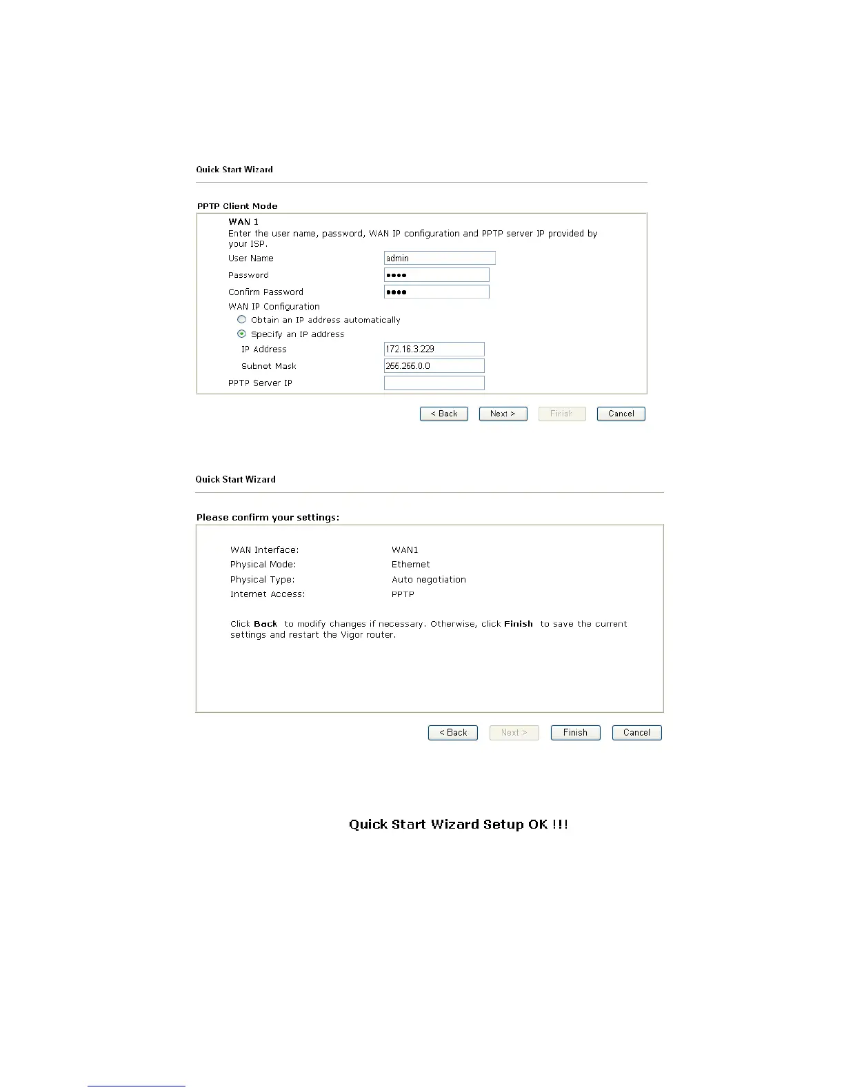 Click Finish. A page of Quick Start Wizard Setup OK!!! will appear. Then, the system