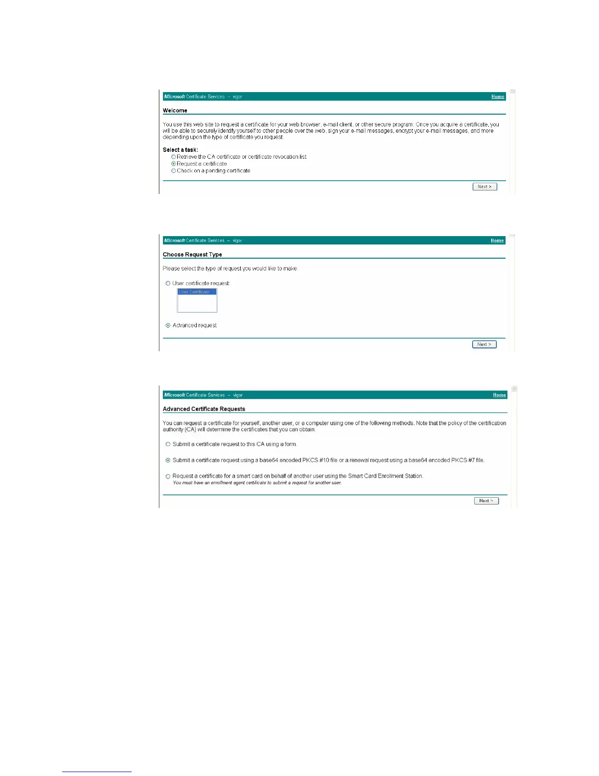 Below we take a Windows 2000 CA server for example. Select Request a Certificate.