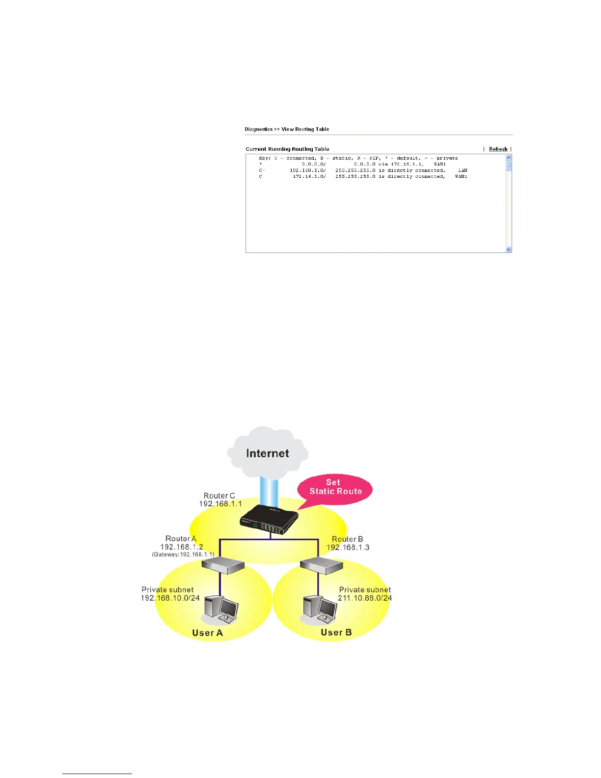 Before setting Static Route, user A cannot talk to user B for Router A can only forward