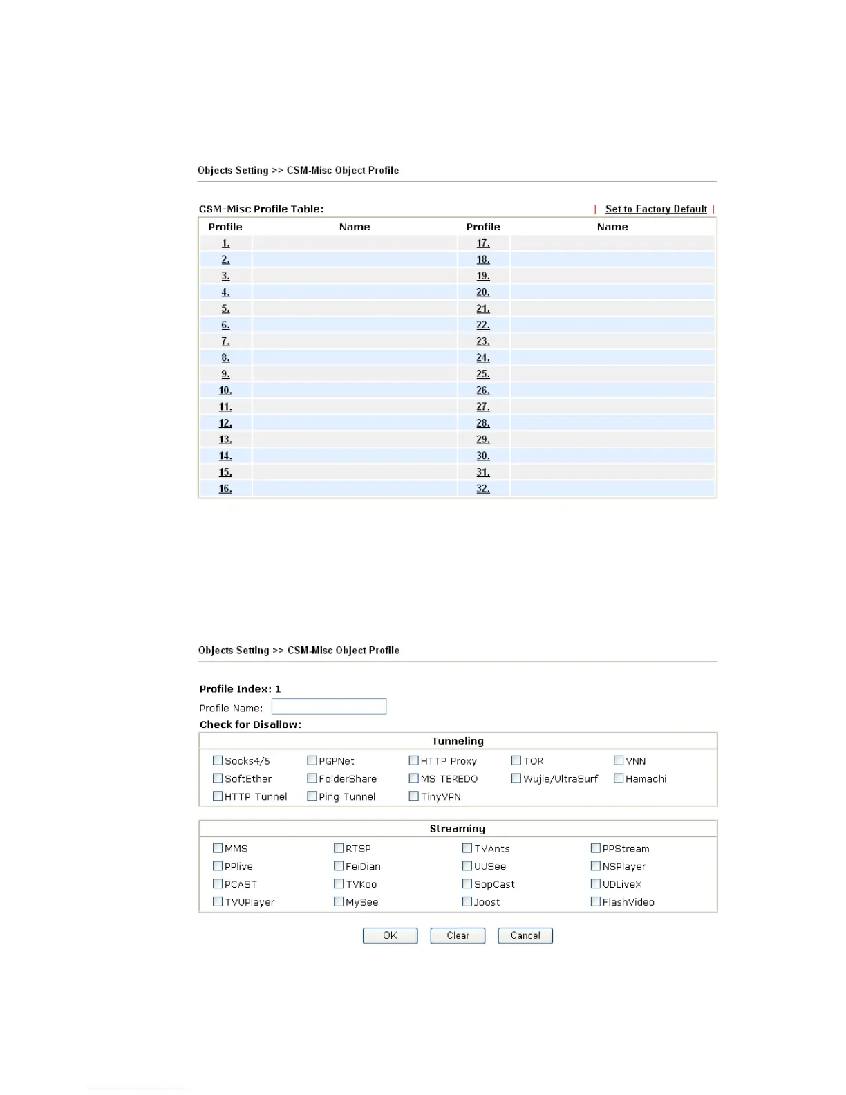 This page allows you to set 32 profiles for miscellaneous applications. These profiles will be