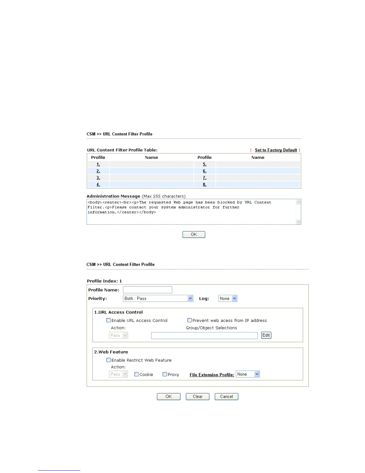 You can set eight profiles as URL content filter. Simply click the index number under Profile
