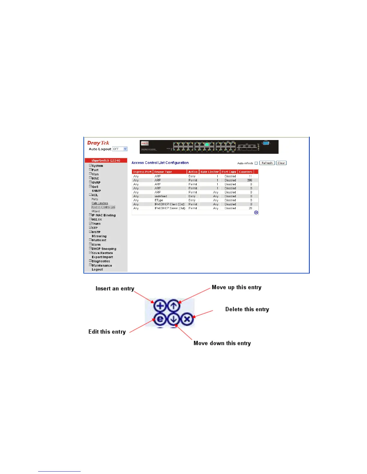 The switch ACL function support up to 128 Access Control Entries (ACEs), using the