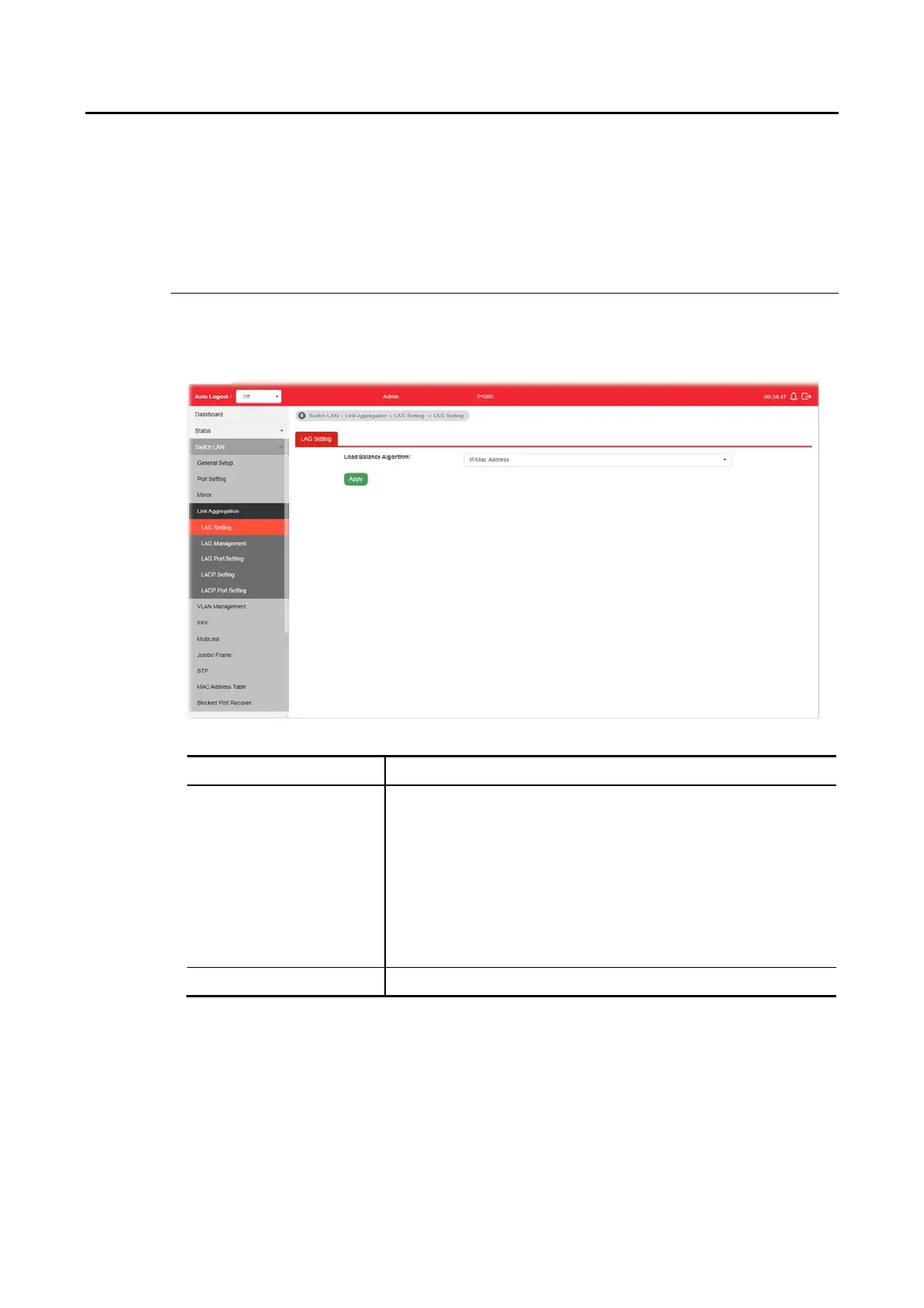 This page allows to configure Load Balance Algorithm for Link Aggregation.