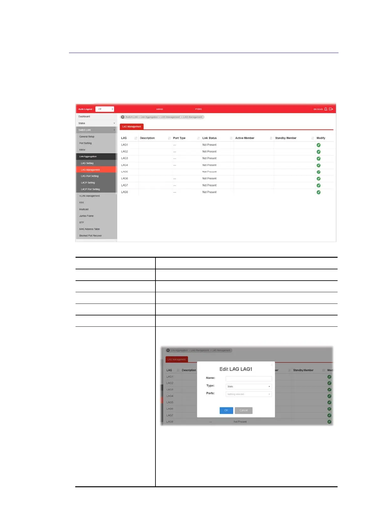 There are eight LAG profiles allowed to group different physical ports (GE1 to GE8). The