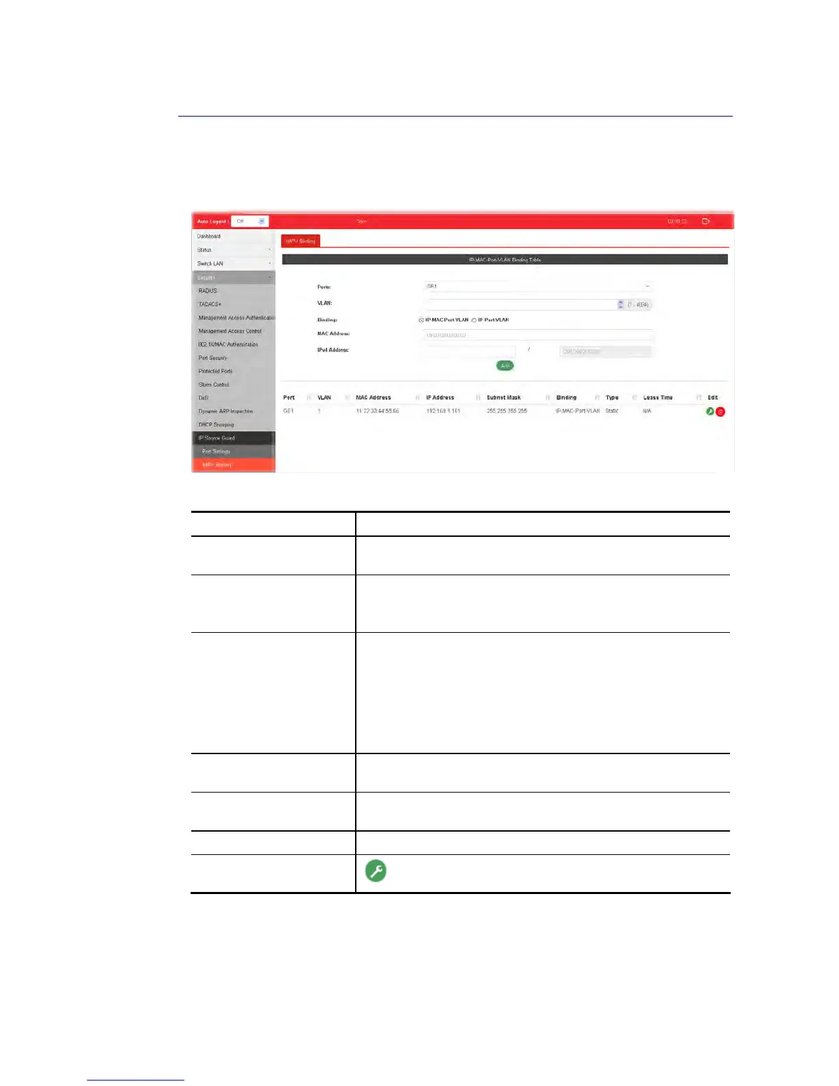 This page allows the network administrator to set the filtering conditions (binding type, MAC