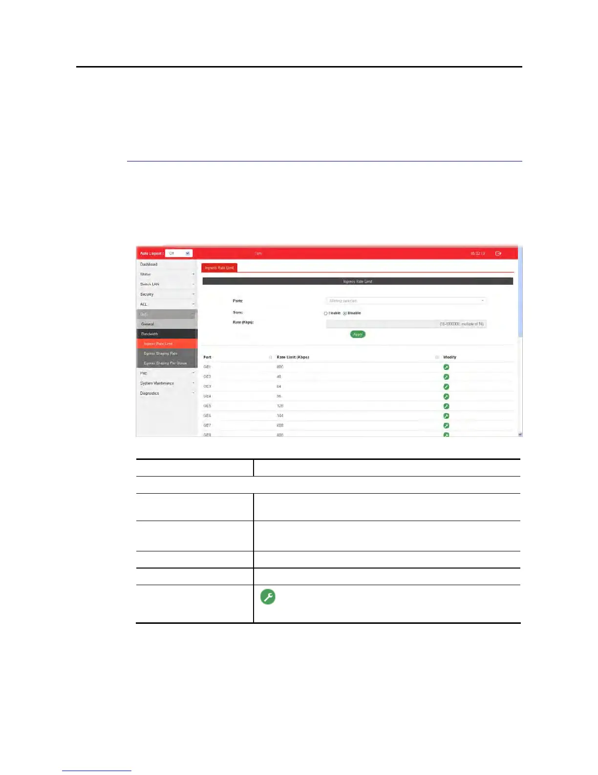 This page allows a user to configure ingress port rate limit. The ingress rate limit is the