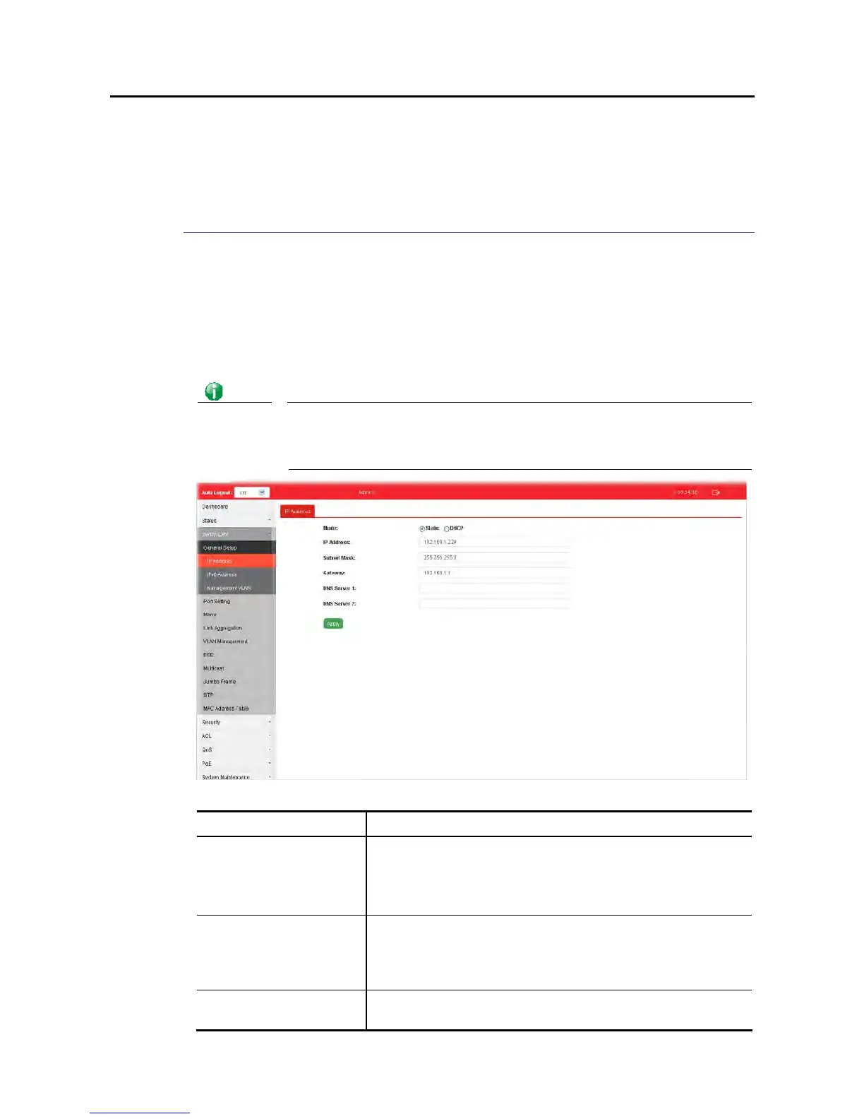 IP Address It is available when Static is selected as Mode.