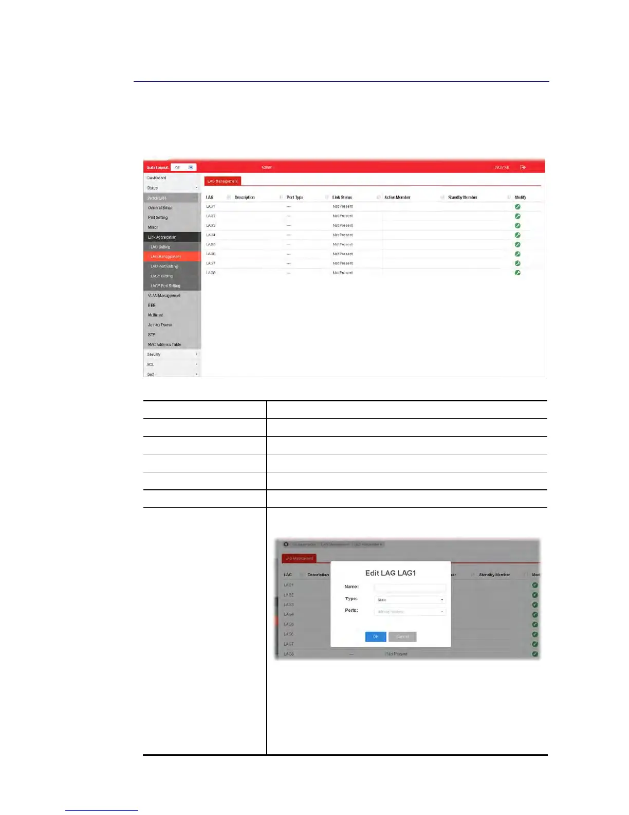 There are eight LAG profiles allowed to group different physical ports (GE1 to GE28). The