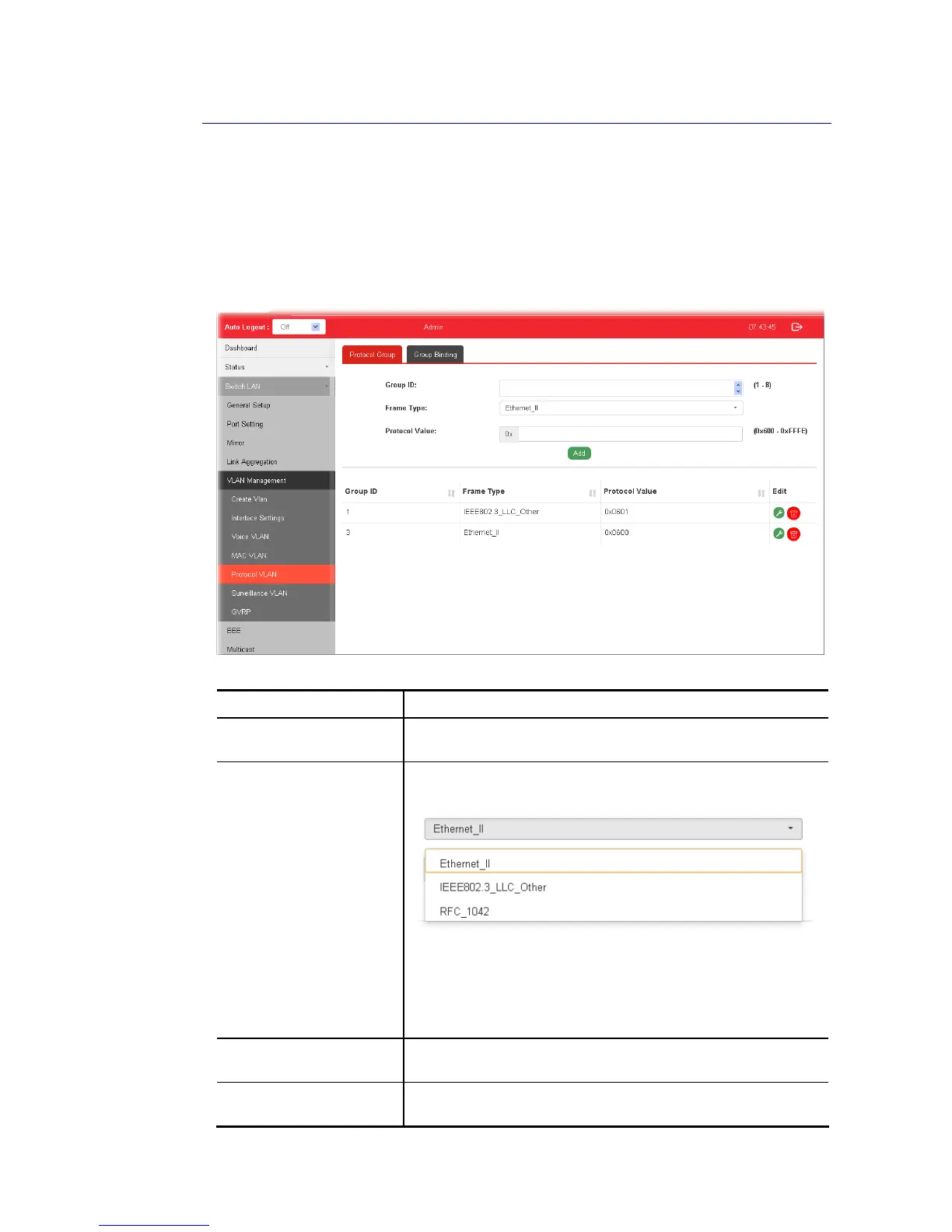 Protocol Value Input a value (ranging from 0x600 ~0xFFFE). Packets match