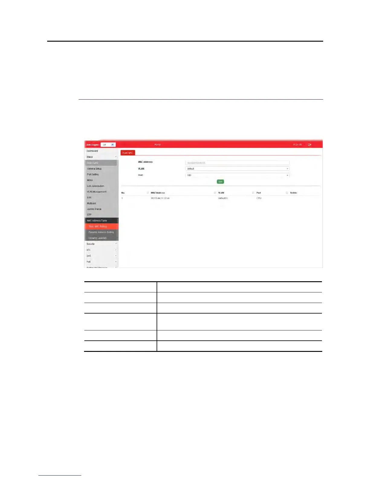 This section allows user to manually assign MAC address into MAC table. The configuration