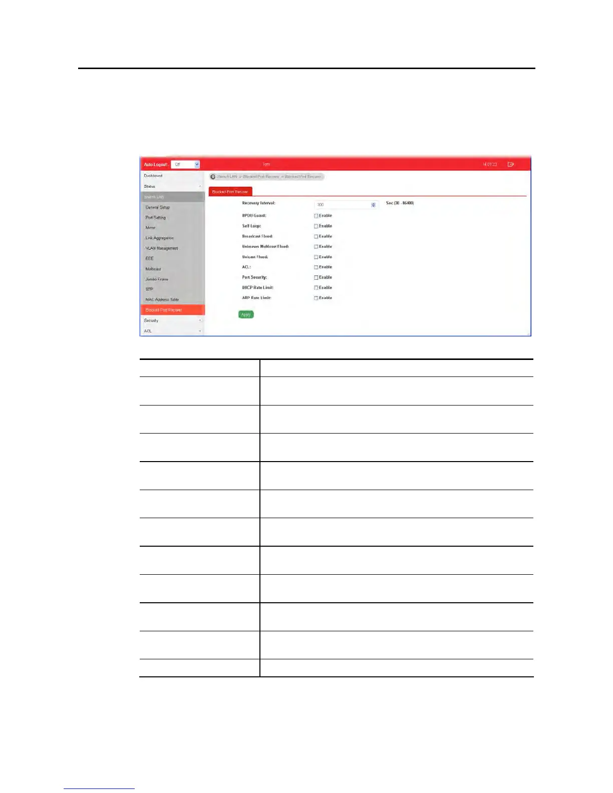 This page is used for configuring settings to recover the port which is being blocked by the
