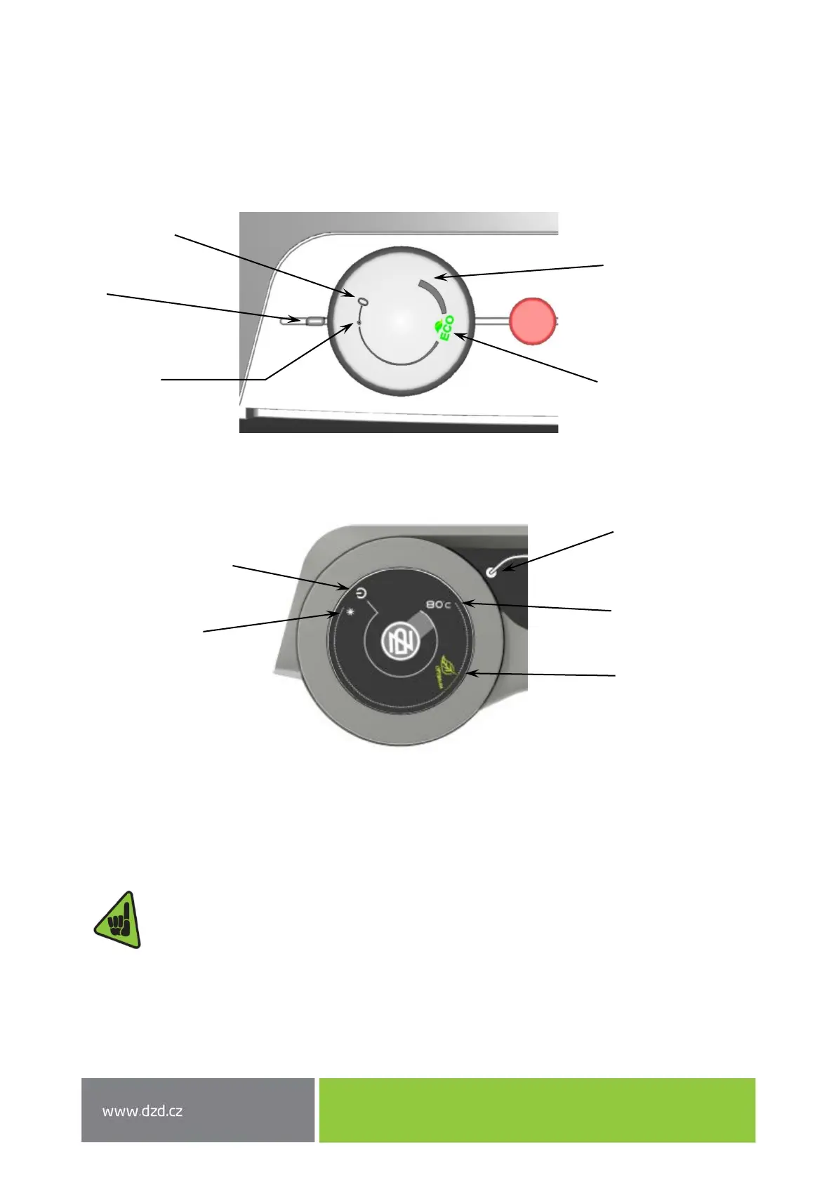 Water temperature is set by turning the thermostat knob. The desired symbol is adjusted against the fixed