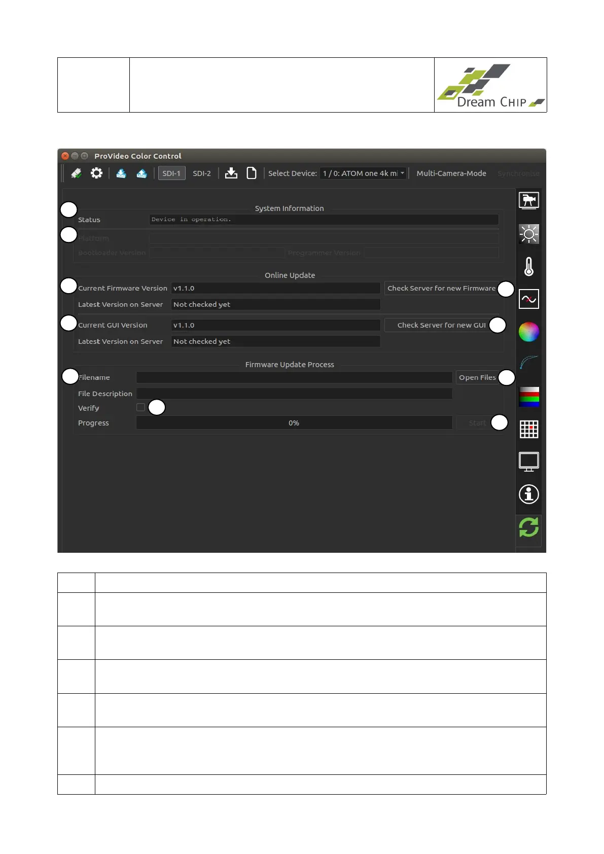 6 Click this button to contact the update server and check for a new GUI version. If a