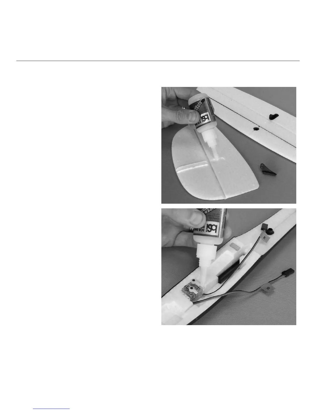 4. Securely install elevator and rudder servos by applying hot glue or a drop or two of medium instant glue