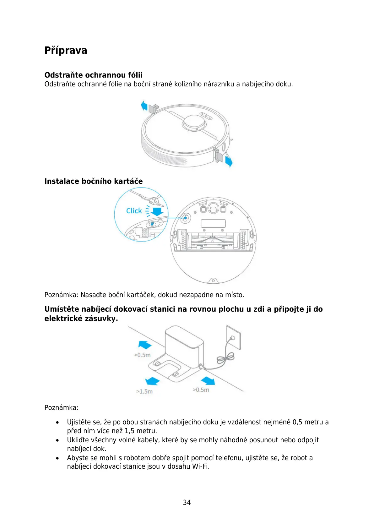 Ujistěte se, že po obou stranách nabíjecího doku je vzdálenost nejméně 0,5 metru a