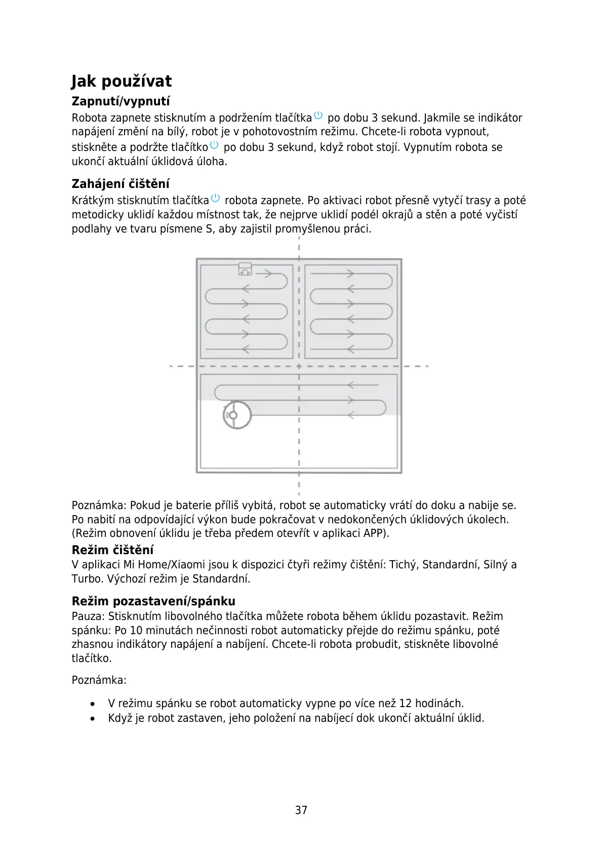 Pauza: Stisknutím libovolného tlačítka můžete robota během úklidu pozastavit. Režim