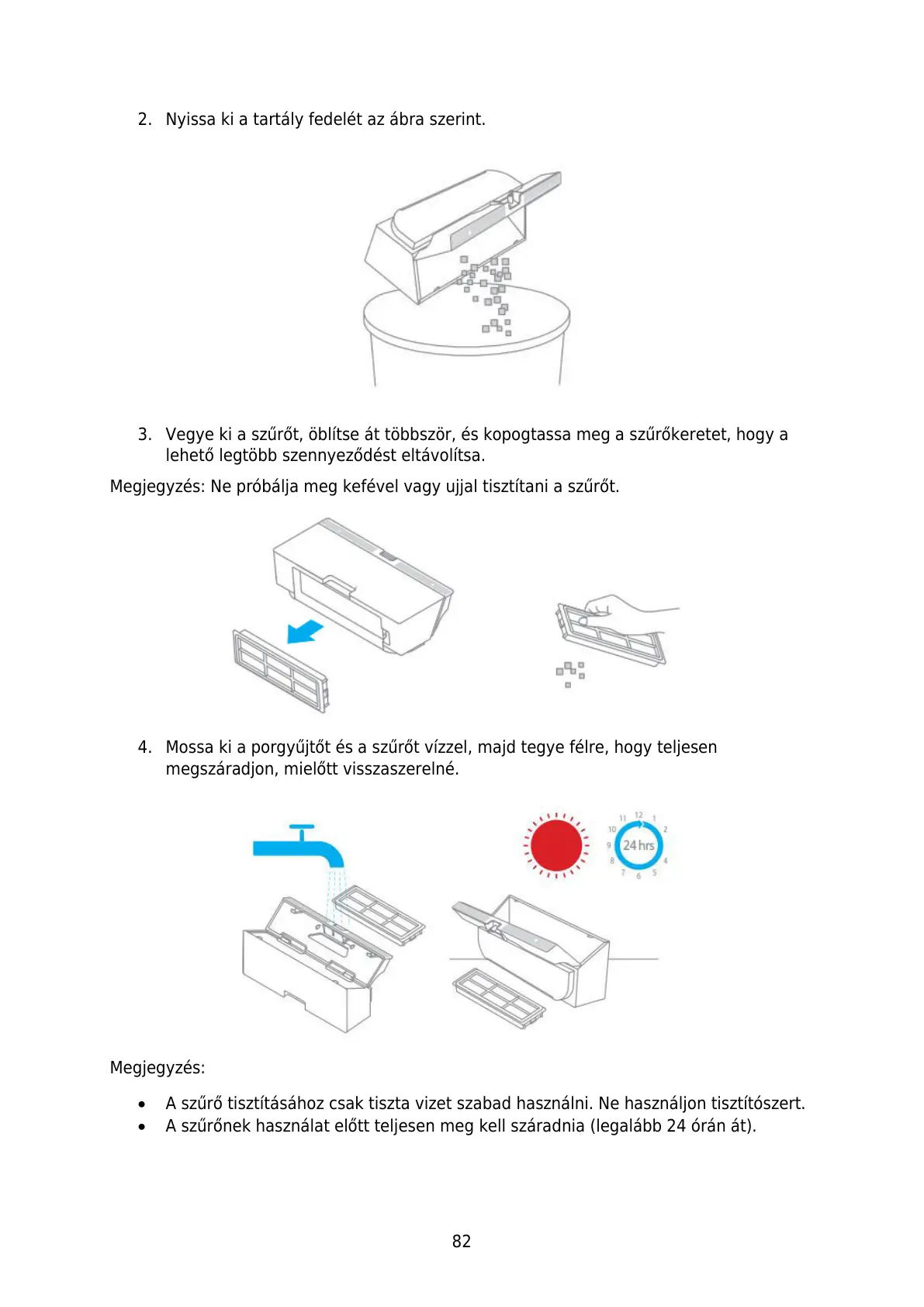 A szűrő tisztításához csak tiszta vizet szabad használni. Ne használjon tisztítószert.