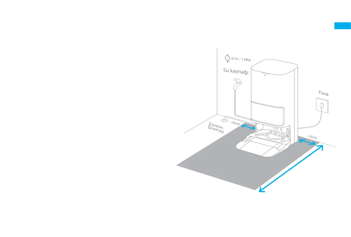 ·Şekilde gösterildiği gibi yeterli alan bırakın ve taralı alandaki nesneleri