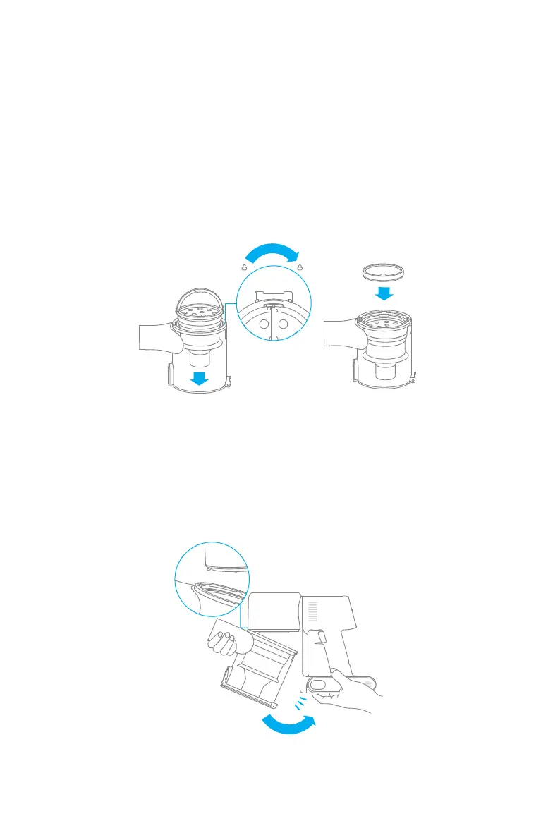 1. Insérez l'ensemble cyclone à la verticale dans le compartiment à poussière. Assurez-