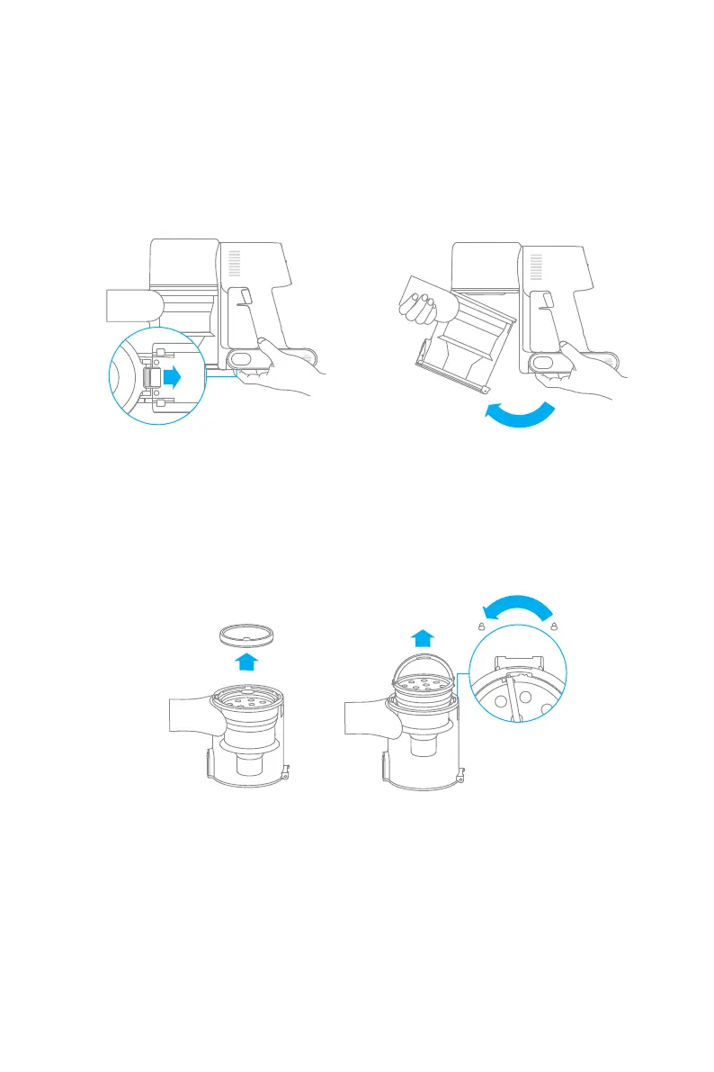 3. Quite primero el preltro, luego levante el mango del ciclón y gire en sentido contrario a