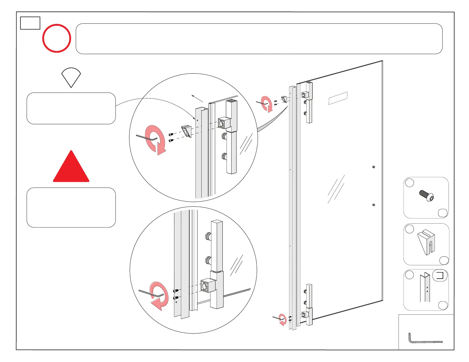 Install the Glass Profile (#07) to the Pivots (#06) using the M6 x 16mm Screws (#09). Note the Glass Bracket