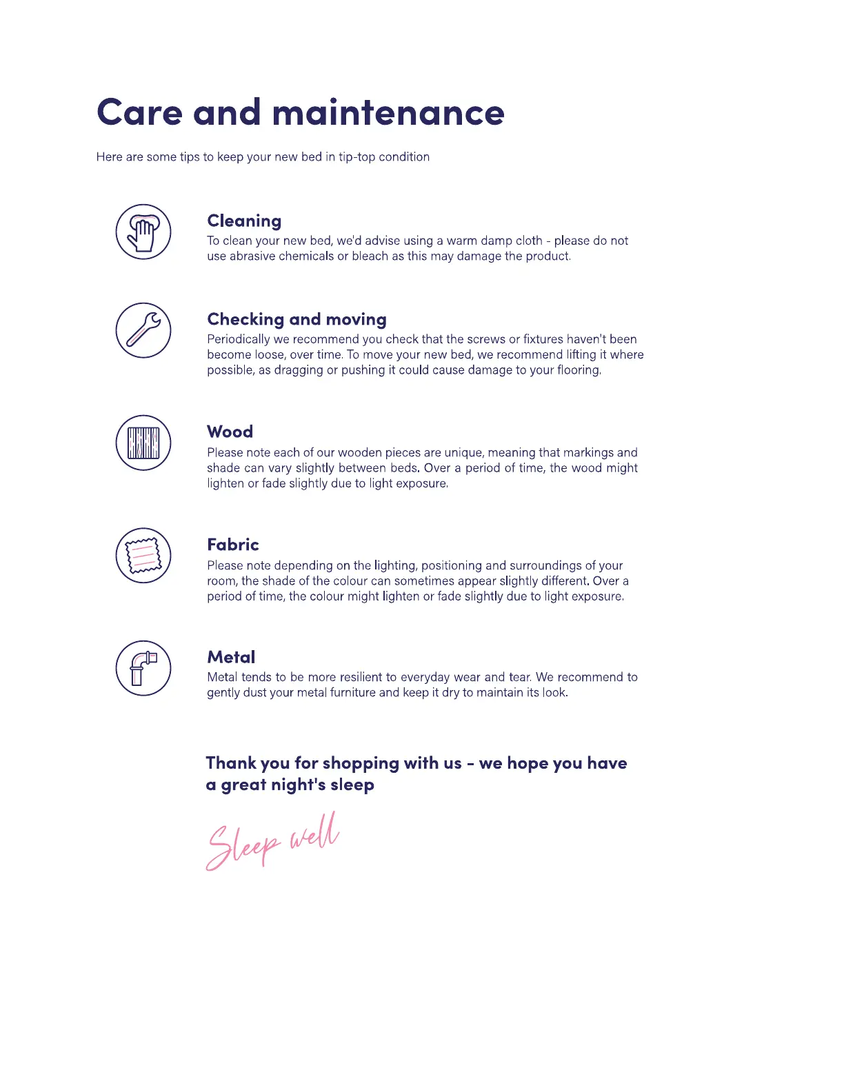 DREAMS Carson - Care and Maintenance Tips; Cleaning Guide; Checking and Moving Advice; Material Care (Wood, Fabric, Metal)