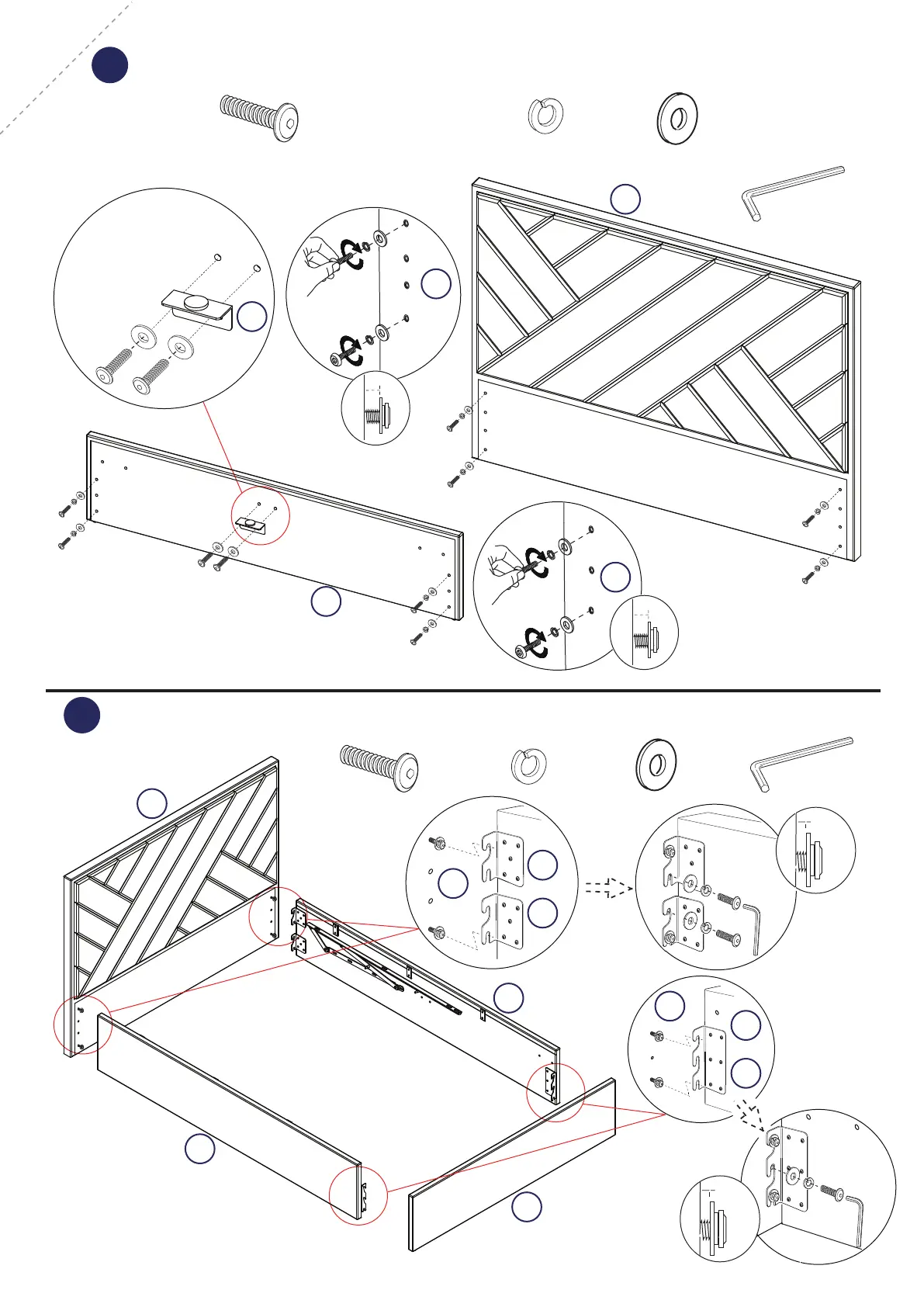 Fit both side rails to headboard & footboard, tighten all bolts 90%.
