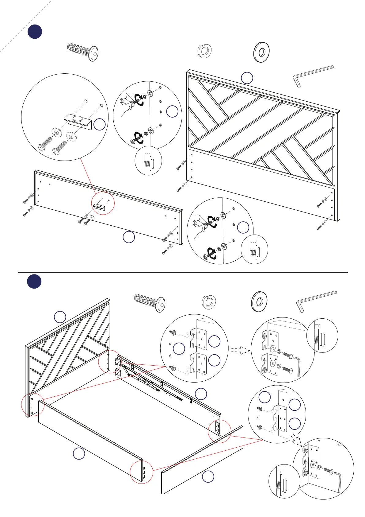 Fit both side rails to headboard & footboard, tighten all bolts 90%.