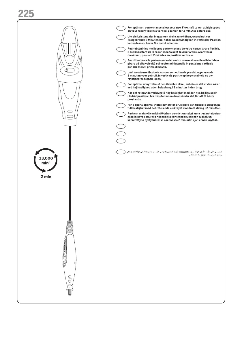 įrankio uždėtam „Flexshaft“ dideliu greičiu vertikaliai veikti 2 minutes.