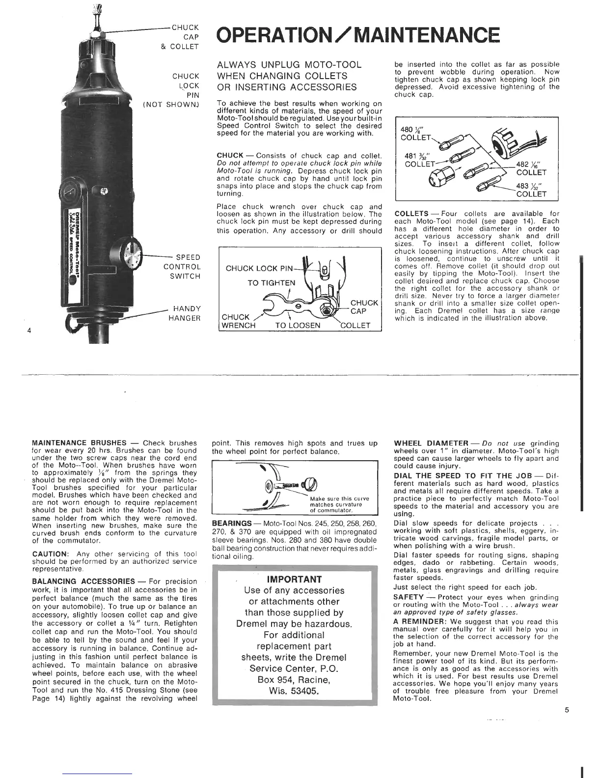 Dremel 370 - OPERATION AND MAINTENANCE; CHUCK; COLLETS; MAINTENANCE BRUSHES
