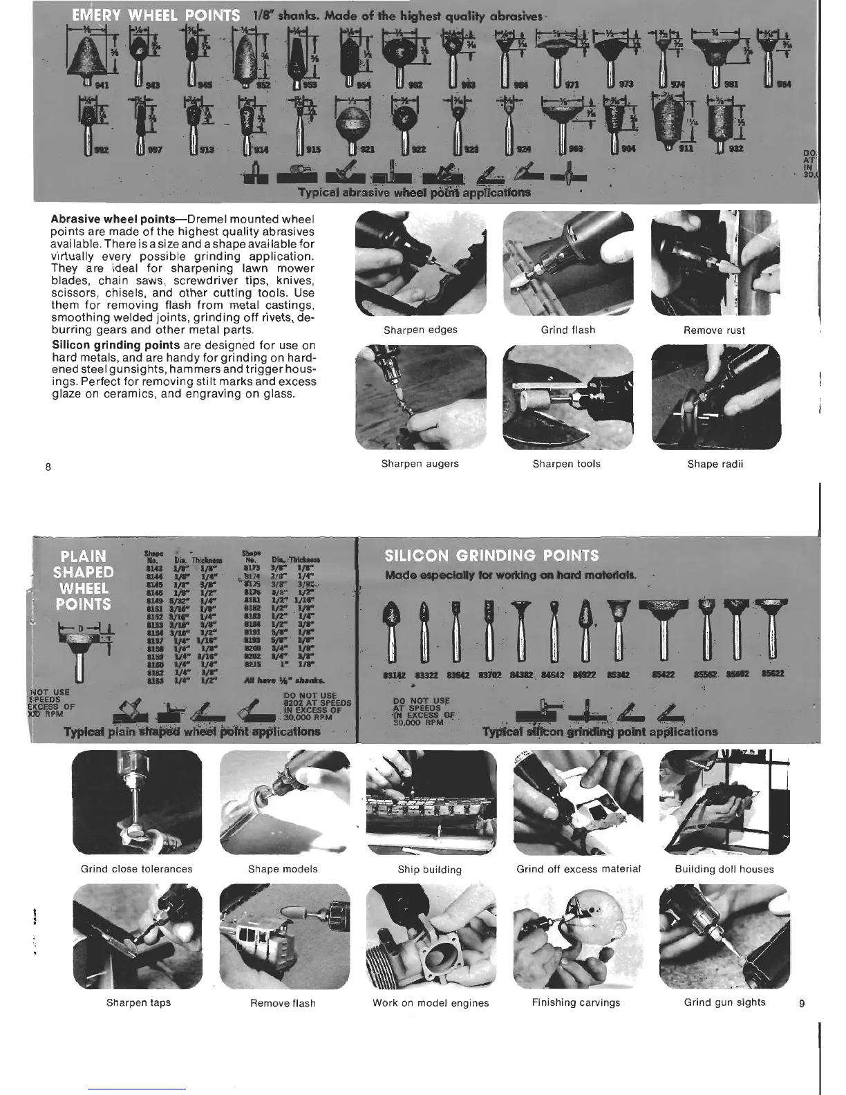 Dremel 370 - EMERY WHEEL POINTS; TYPICAL ABRASIVE WHEEL POINT APPLICATIONS; ABRASIVE WHEEL POINTS; PLAIN SHAPED WHEEL POINTS