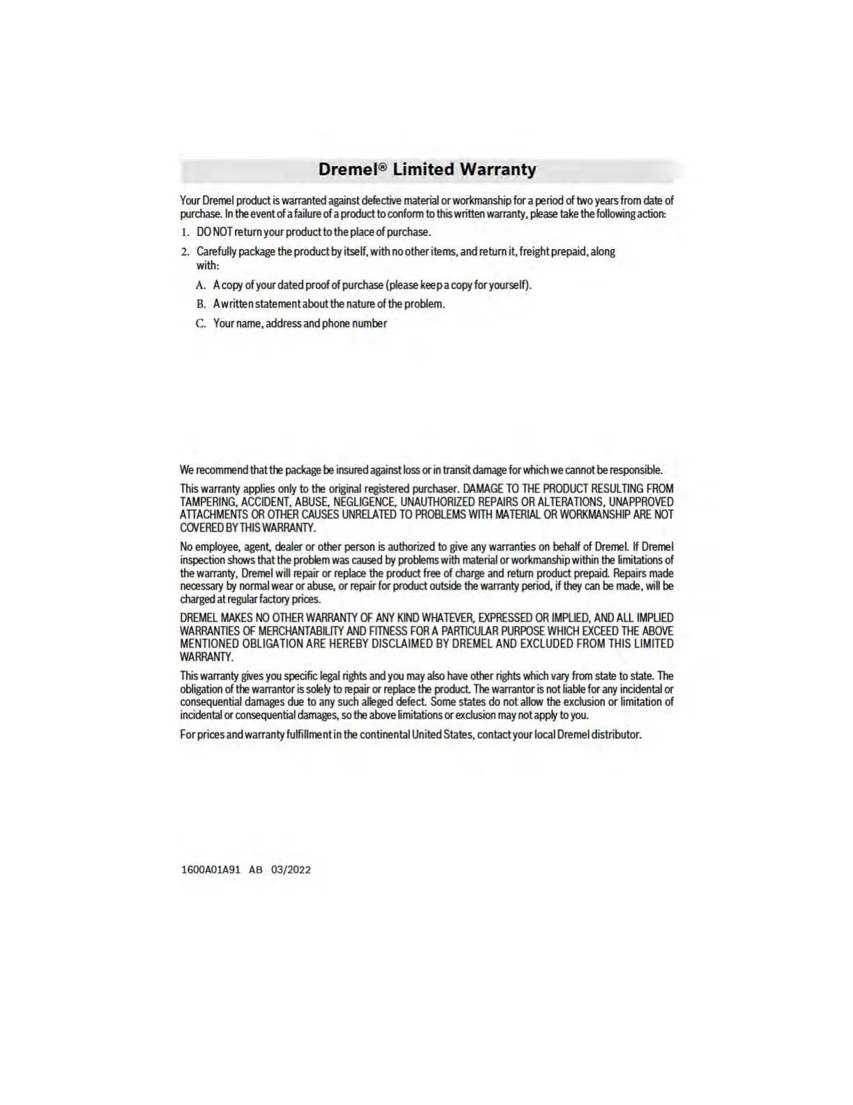 Dremel Lite 7760 - Dremel Limited Warranty