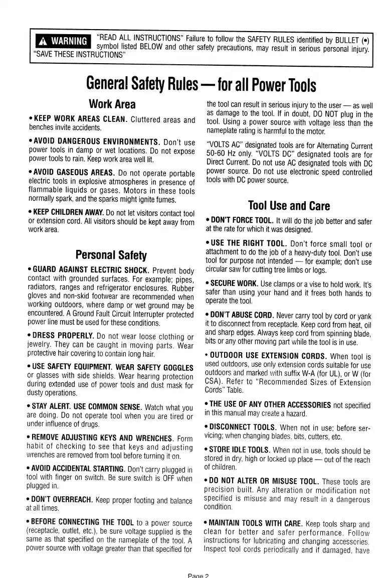 Dremel MultiPro 395 - General Safety Rules; Work Area Safety; Personal Safety Precautions; Tool Use and Care Guidelines