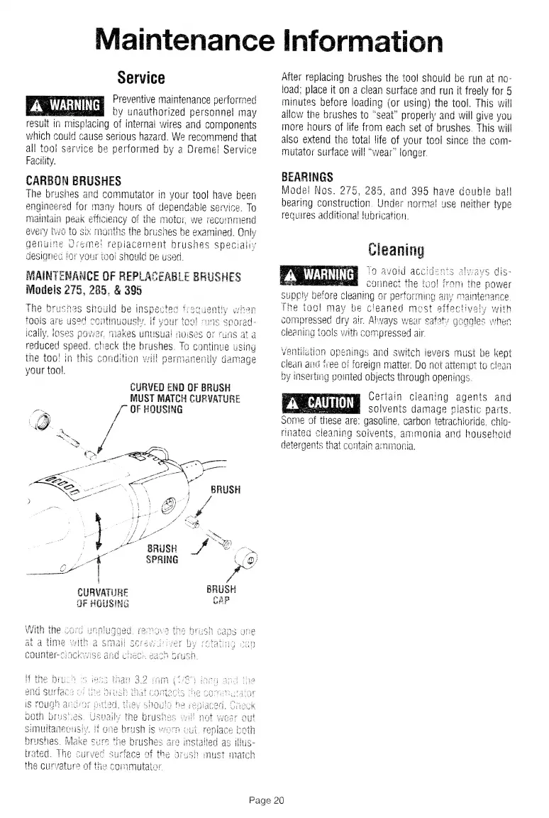 Dremel MultiPro 395 - Maintenance Information; Tool Service and Brush Replacement; Cleaning and Bearing Information