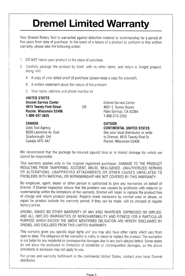 Dremel MultiPro 395 - Dremel Limited Warranty
