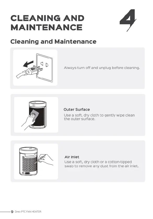 dreo Atom 316 - Cleaning and Maintenance; Cleaning the Outer Surface; Maintaining Air Intakes