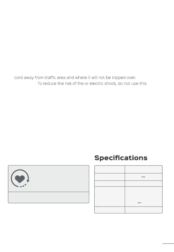 Do not run cord under carpeting. Do not cover cord with throw rugs, runners,