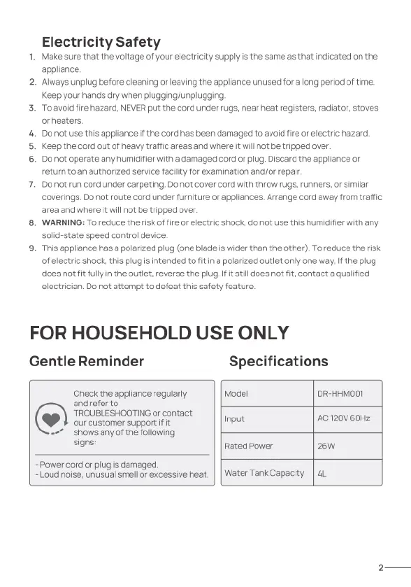 dreo HM311 - Electrical Safety Precautions; Household Use Specifications