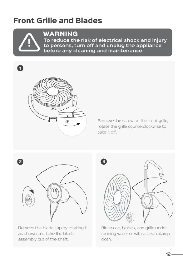 dreo Lynx CF511 - Front Grille and Blades Cleaning; Cleaning Warning