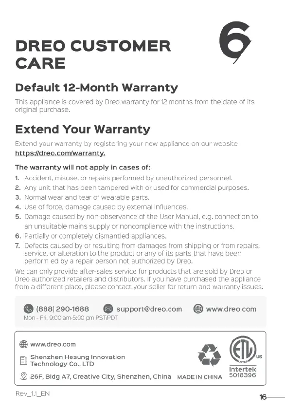 dreo Lynx CF511 - Dreo Customer Care; Default 12-Month Warranty; Extend Your Warranty