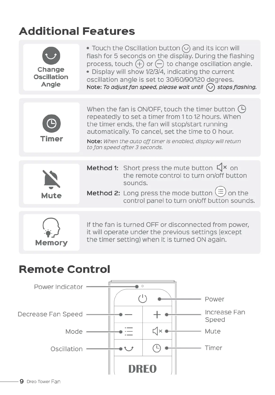 dreo Pilot Max S - Additional Features; Change Oscillation Angle; Timer; Mute