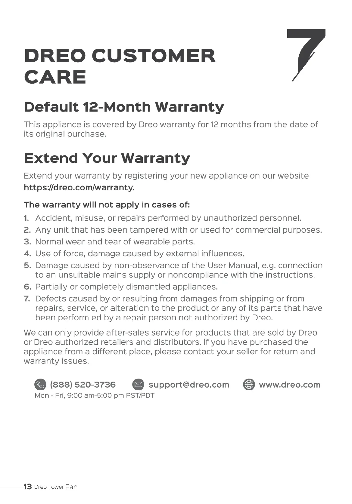 dreo Pilot Max S - Dreo Customer Care; Default 12-Month Warranty; Extend Your Warranty