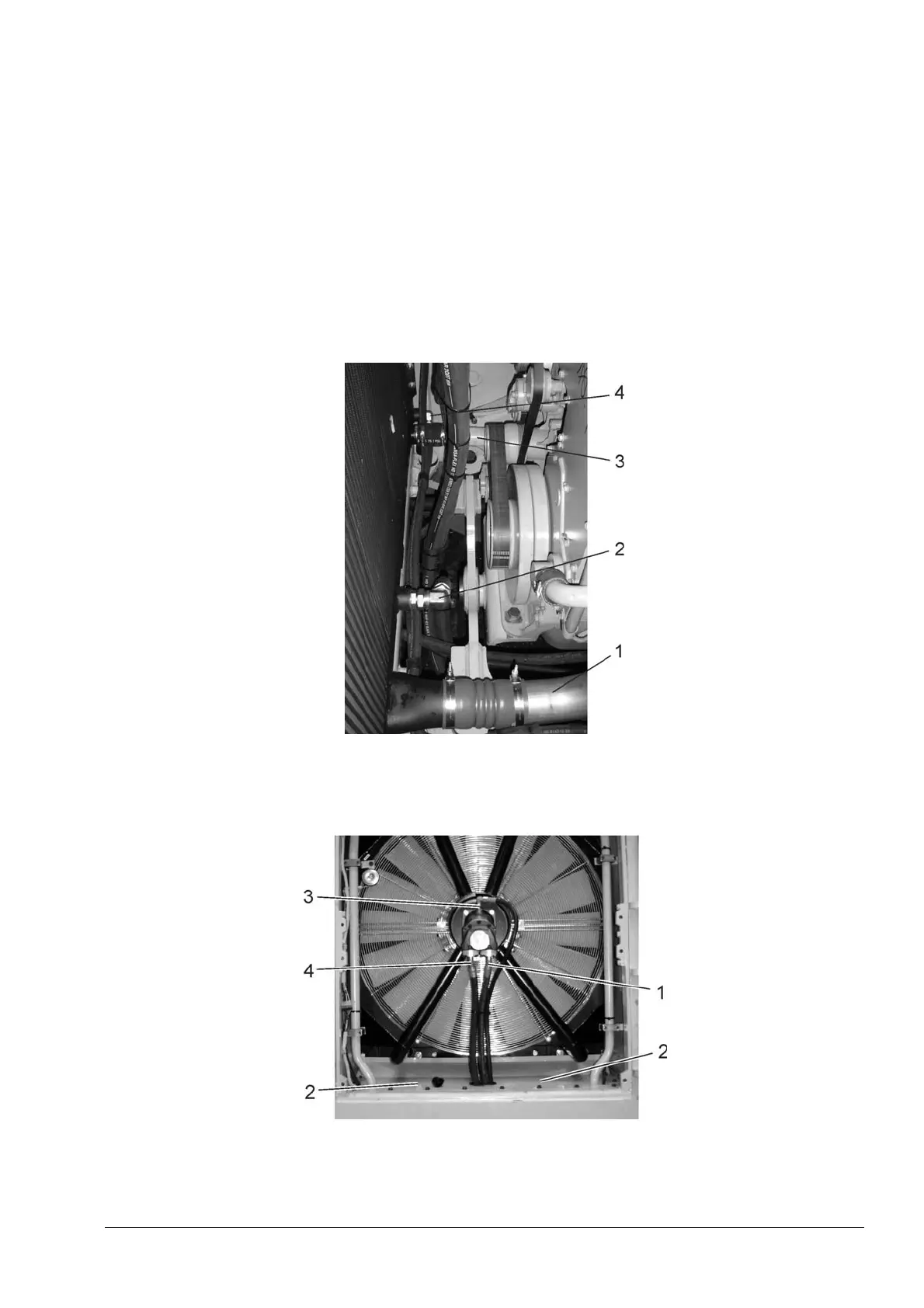 20. Remove hydraulic hose (2) from drive train oil cooler. Secure hose in an upright